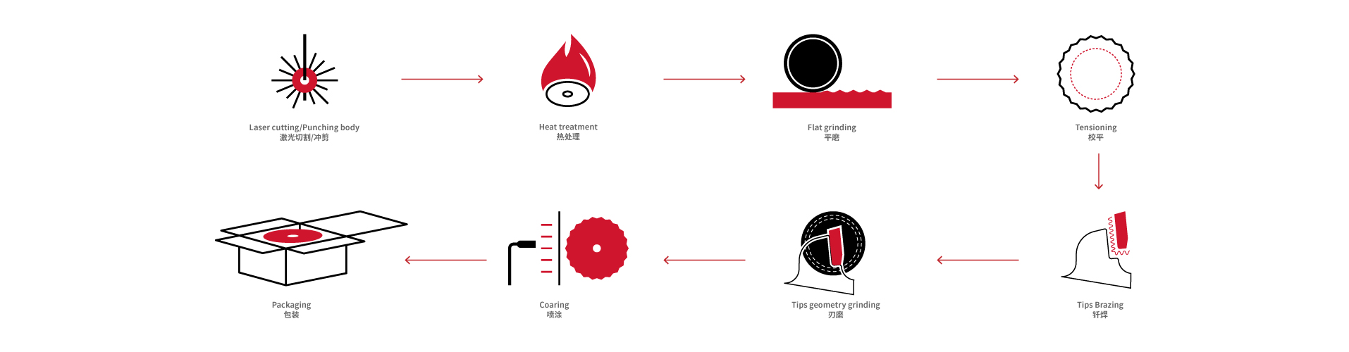 選用最高品質(zhì)的鋼板并在增強強度和穩(wěn)定性方面取得平衡。鋼板經(jīng)過激光割并根據(jù)鋸片的應(yīng)用范圍通過回火達到正確的硬度。很重要的一點是,通過合理的熱處理工藝,使硬度、韌度和平面度相互協(xié)調(diào)。刀體過硬,則在高壓力下容易開裂;刀體過軟,則在剪切力作用下容易折彎。